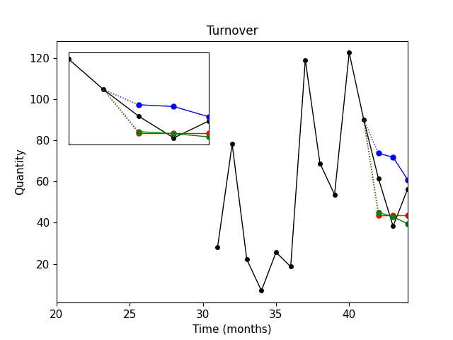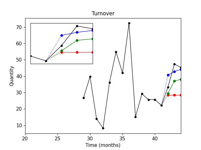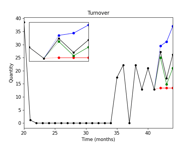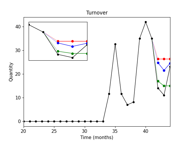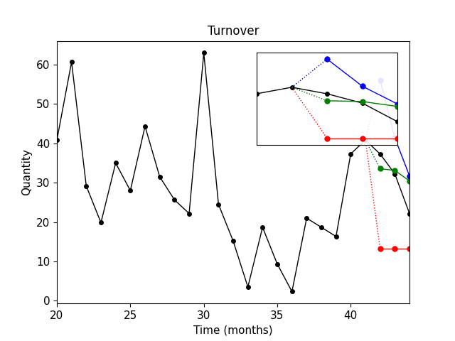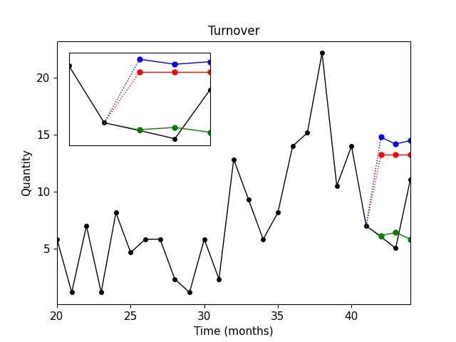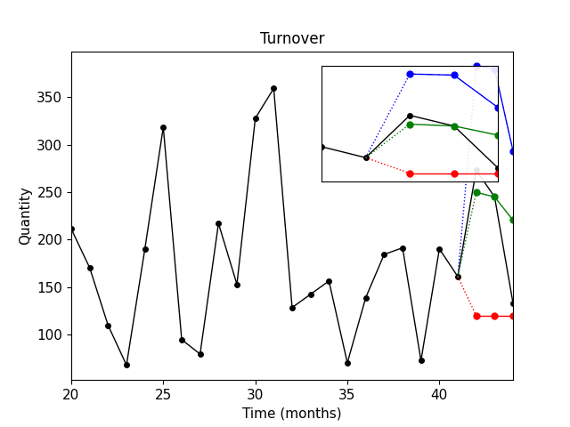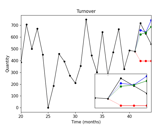 Černá křivka – skutečné prodeje.