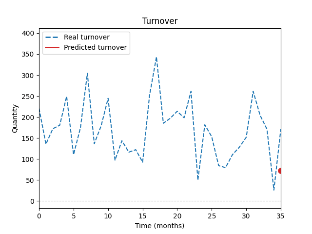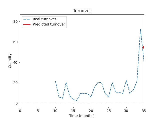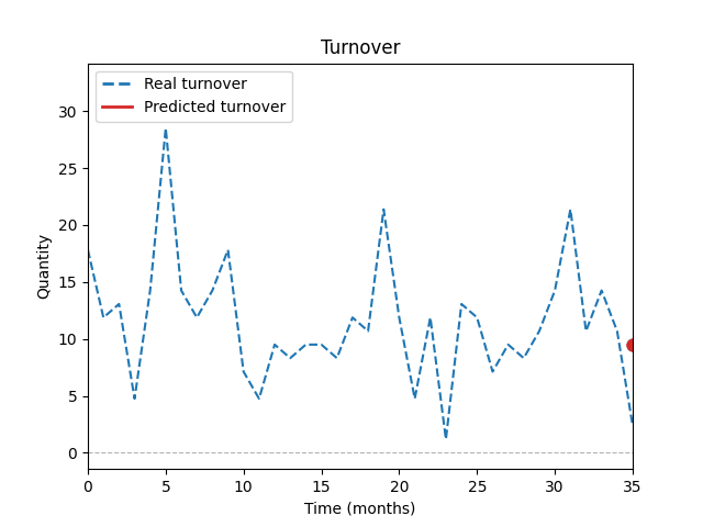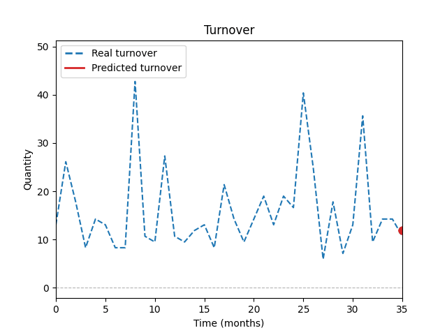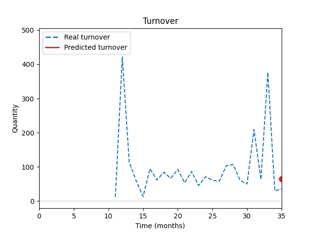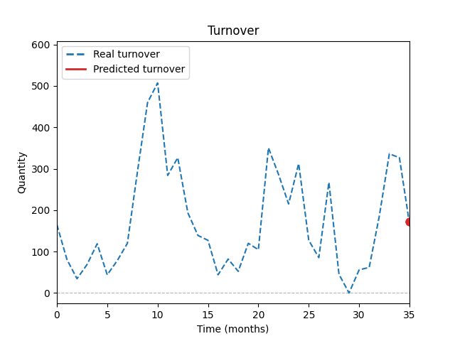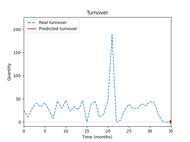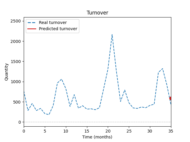 Graf ukazuje porovnání historických prodejů se simulací modelu AI během tréninku. Predikce je počítána každý měsíc na základě historických dat, podobnosti položek a vlivu slevových akcí.