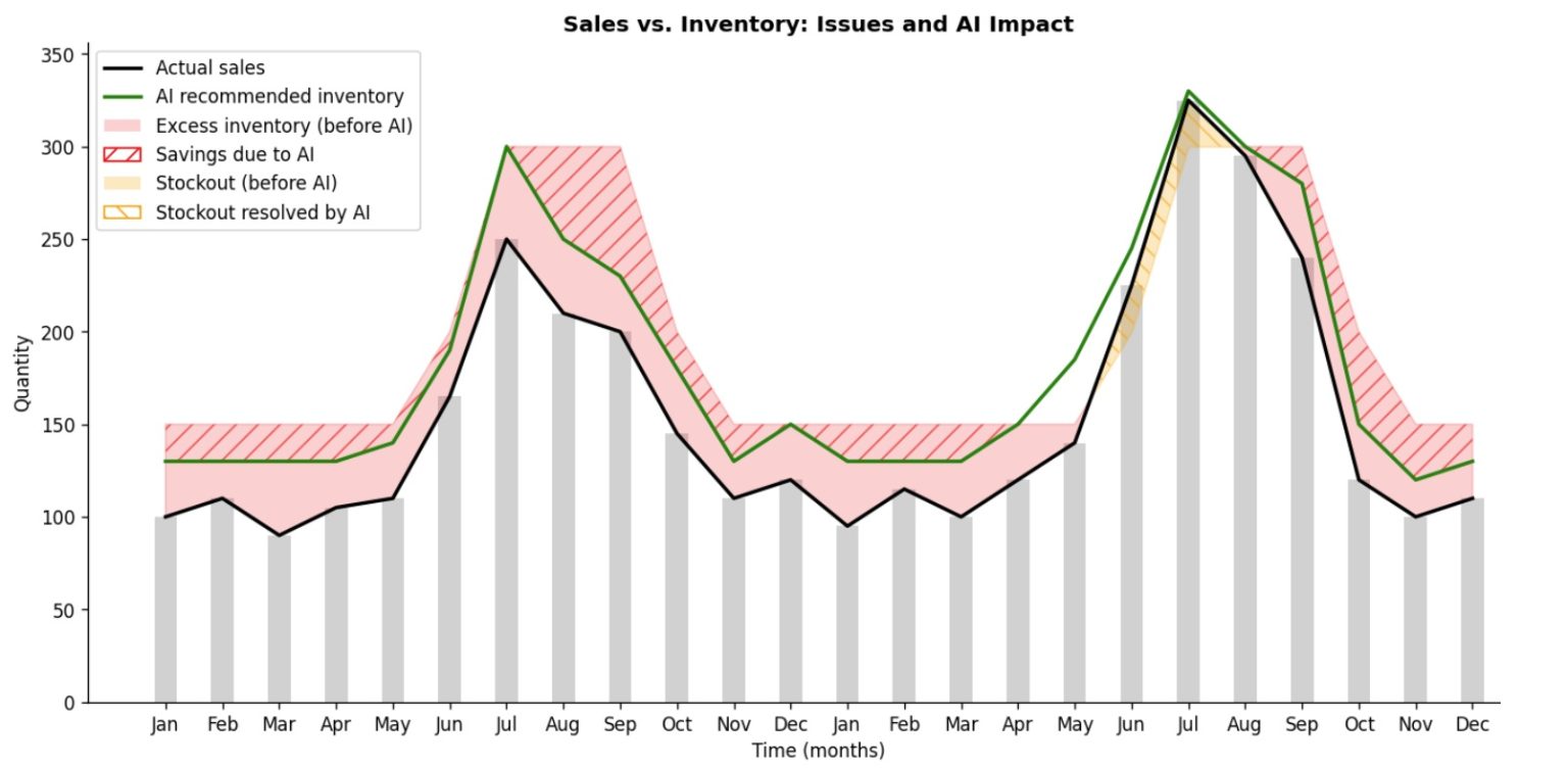 Ukázka historických prodejů a zásob: přebytky, nedostatky a úspora díky AI predikci.