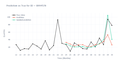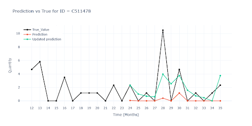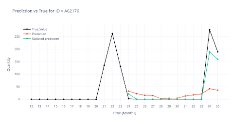 Typickým příkladem jsou vánoční položky. Deset měsíců se neprodávají, v listopadu a prosinci prodej doslova vystřelí. Hlavním úskalím zde bylo naučit model, aby rozpoznal sezónní prodeje od náhodných prodejů nebo outlinerů. V tréninkovém okně (33 měsíců) měla položka takové vrcholy pouze dva, takže model je snadno považoval za šum a dál předpovídal nuly.
